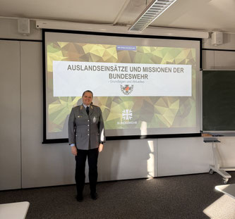 Als Referent für Sicherheitspolitik informierte der erfahrene Jugendoffizier der Bundeswehr Hauptmann von Skrbensky in verschiedenen Klassen zu aktuellen, gesellschaftlich relevanten Themen wie der deutschen Sicherheitspolitik im 21. Jahrhundert, die Entwicklung der NATO und den Nahost-Konflikt.